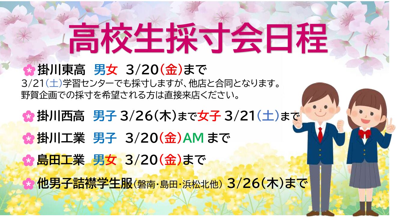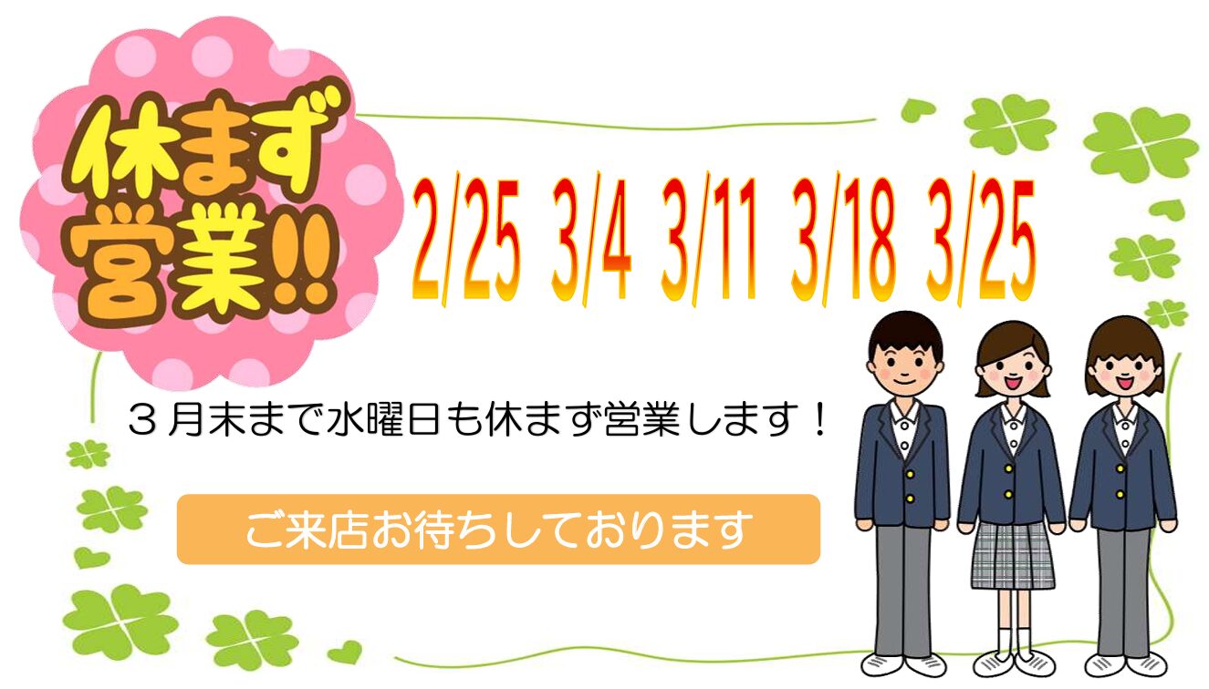 その間、ご近所の方は制服を直接買いに来られていて、「良い制服が安価だ」と喜んでいただきました。ご入学から3年後の卒業まで、お子さんがすくすく健やかに育ちますように、3年間精一杯の応援を致します。